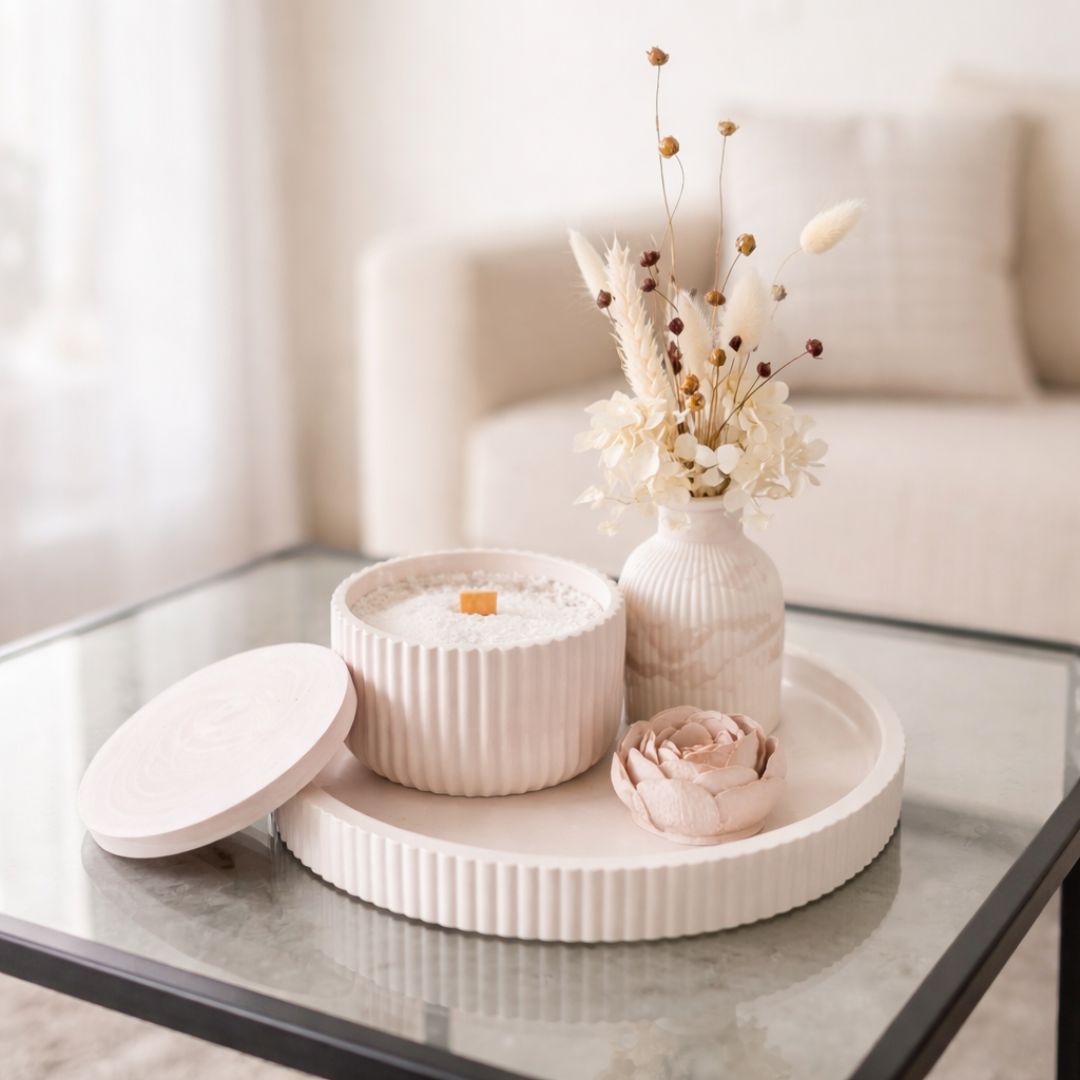 Handgegossener Gips und sanftes Kerzenlicht. Eine Kollektion, die Ruhe und Geborgenheit ausstrahlt.