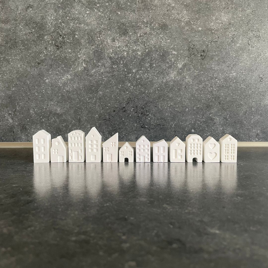- 6 bzw. 12 handgefertigte Gips-Häuser im Set - perfekt abgestimmte Vielfalt