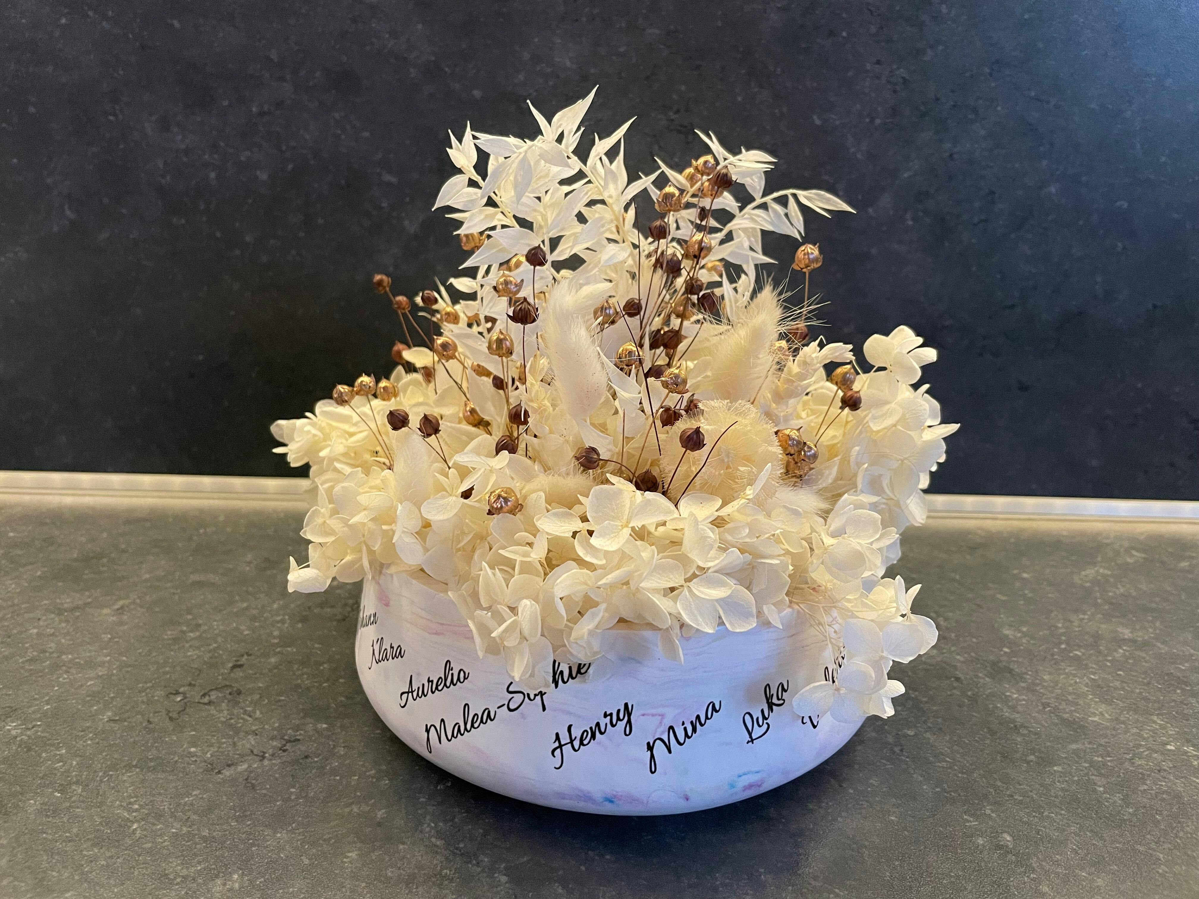 Dieses einzigartige Blumengesteck kombiniert eine handgemachte Schale aus Gips mit kunstvoll gefertigten Blumen aus Gips und dekorativen Trockenblumen. So entsteht ein zeitlos schönes Arrangement, das ohne Pflege für immer frisch bleibt.