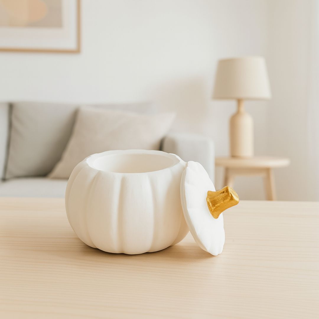 Unsere handgemachte Kürbisdose aus Gips vereint stimmungsvolle Herbstdeko mit praktischer Funktion. Die detailverliebte Form macht sie zu einem echten Blickfang, während der Kürbis Platz für kleine Schätze bietet - ob Süßigkeiten, Schmuck oder liebevolle Botschaften.
