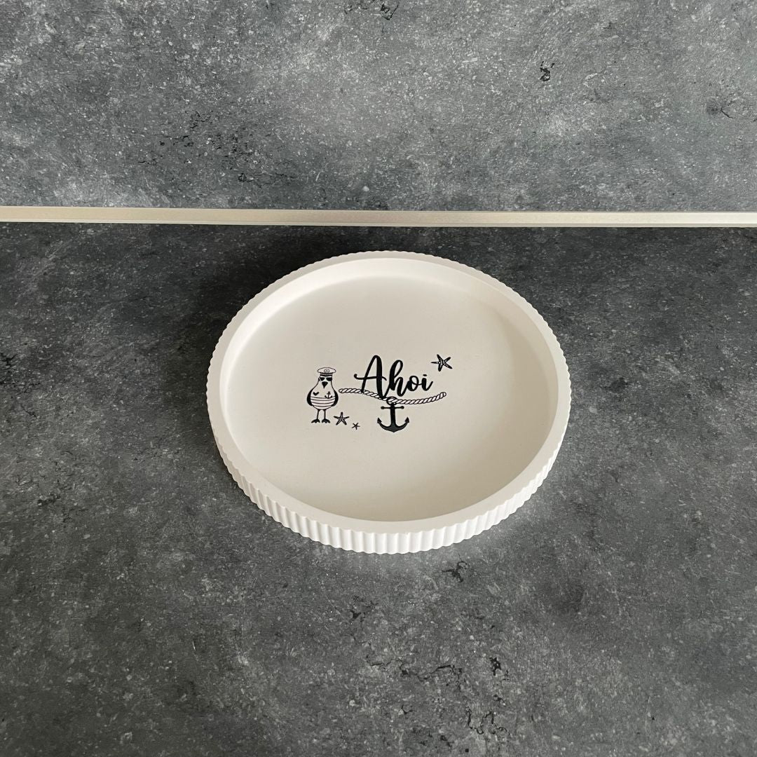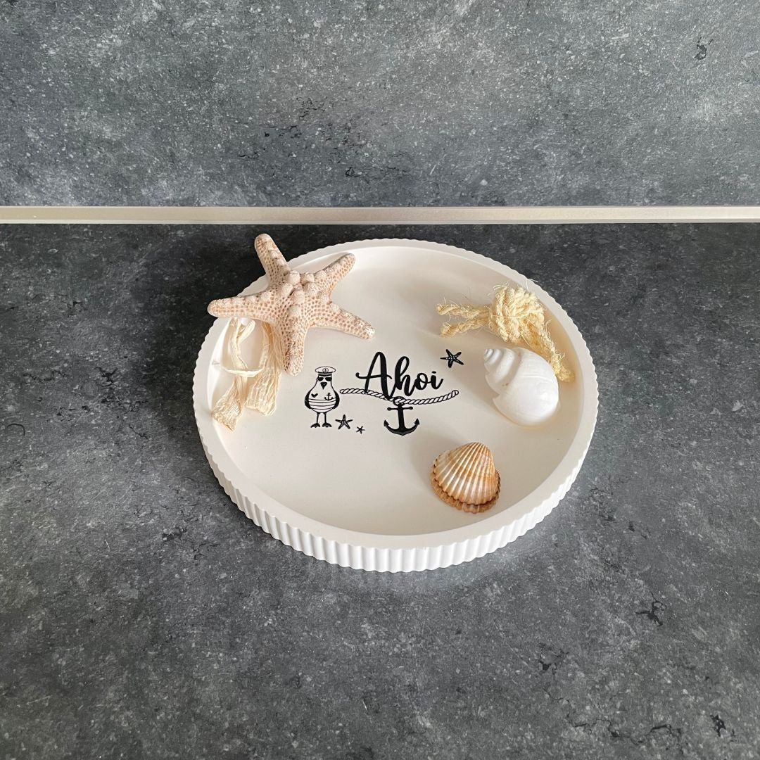 Handgemacht mit Liebe - zeitlos in Form, vielseitig in Funktion. Unsere runde, geriffelte Deko-Platte ist ein echtes Statement-Stück. Gefertigt aus hochwertigem Gips mit dem Schriftzug "Ahoi", verleiht sie jedem Raum einen stilvollen, natürlichen und zugleich sommerlichen Touch.